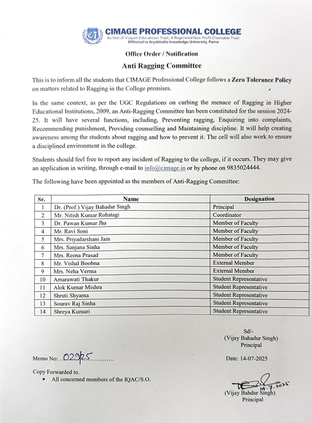 At CIMAGE Professional College, we uphold a strict zero-tolerance policy against ragging. We are committed to fostering a safe, inclusive, and intellectually enriching environment where every student is treated with dignity and respect.